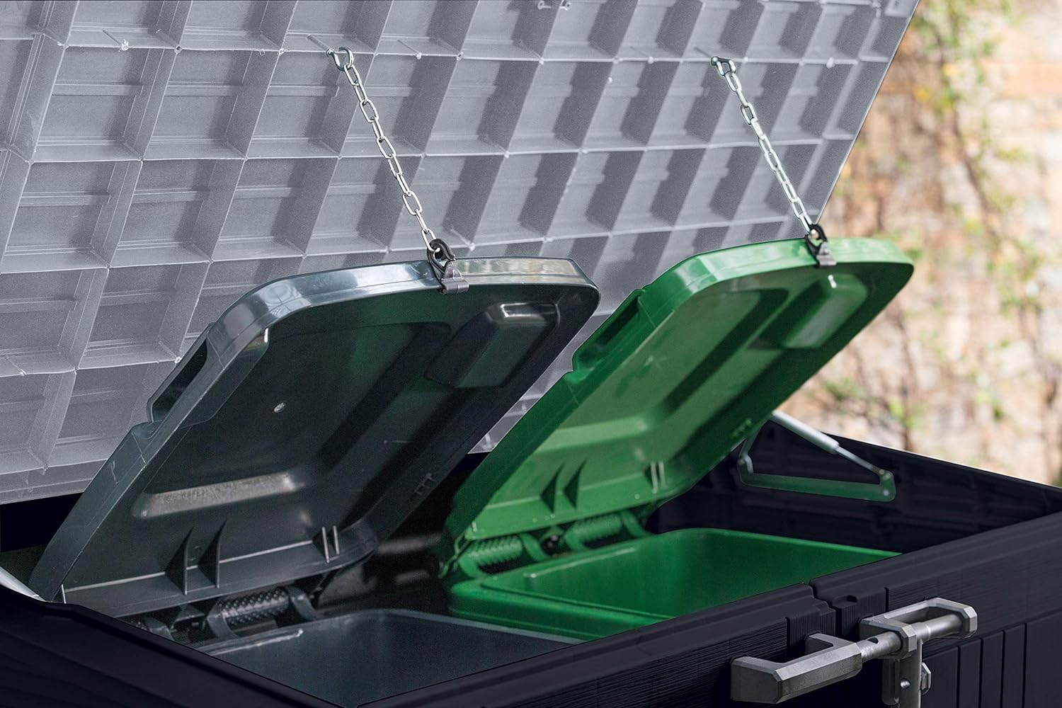 - Ideal outdoor storage solution for garden tools and equipment, BBQ and accessories and x2 120L wheelie bins