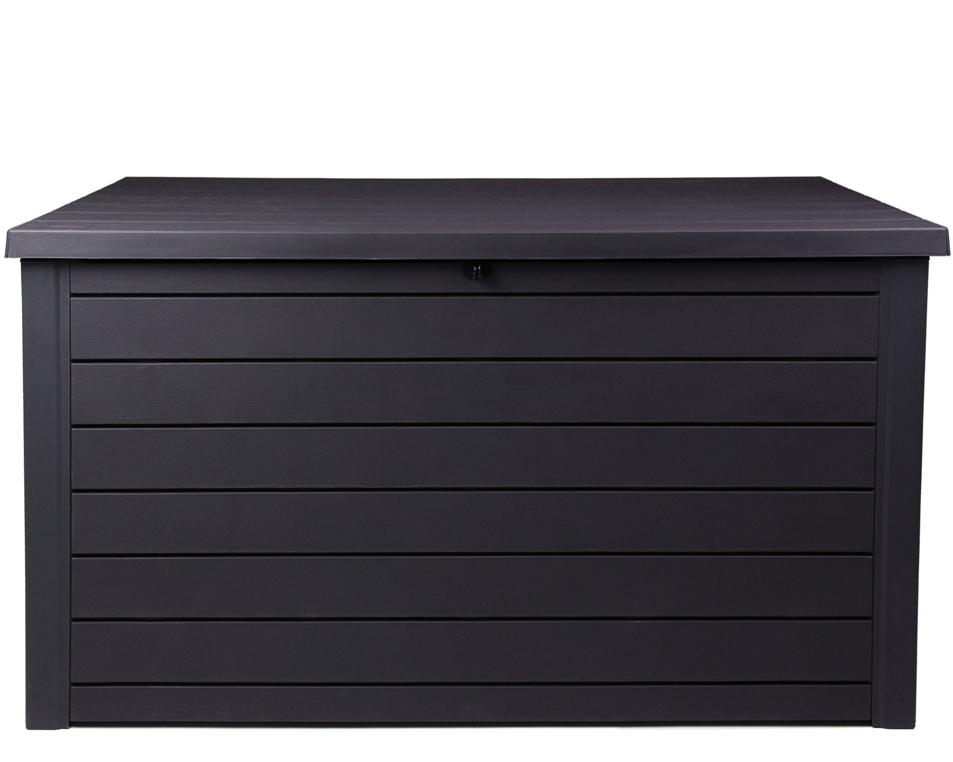 Our cushioned boxes are unique due to many advantages. In addition to the huge volume of 870 litres, which is produced by the dimensions of approx. 146 x 82 x 86 (H) cm and usable dimensions of approx. 132 x 72 x 79 cm and thanks to its high-quality plastic material (polypropylene), the storage box has the best conditions for all outdoor requirements. The garden box is both weatherproof and UV-resistant. Thanks to the UV protection, the modern, anthracite-coloured wood look will be preserved for a long time.