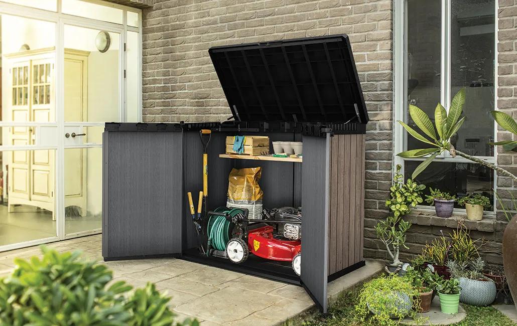 Ideal outdoor storage solution for garden tools and equipment, BBQ and accessories and x2 240L wheelie bins