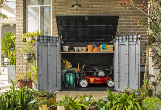 The Store-It-Out Pro keeps contents dry and safe, come rain or shine. Ideal for garden furniture, barbecues, or other accessories, the weather-resistant bin has a 1200 L / 42 cu. ft. capacity and comes with a sloped threshold that makes rolling heavier furniture in and out easy, hydraulic pistons on the lid for easy one-hand opening, and lockable front doors.